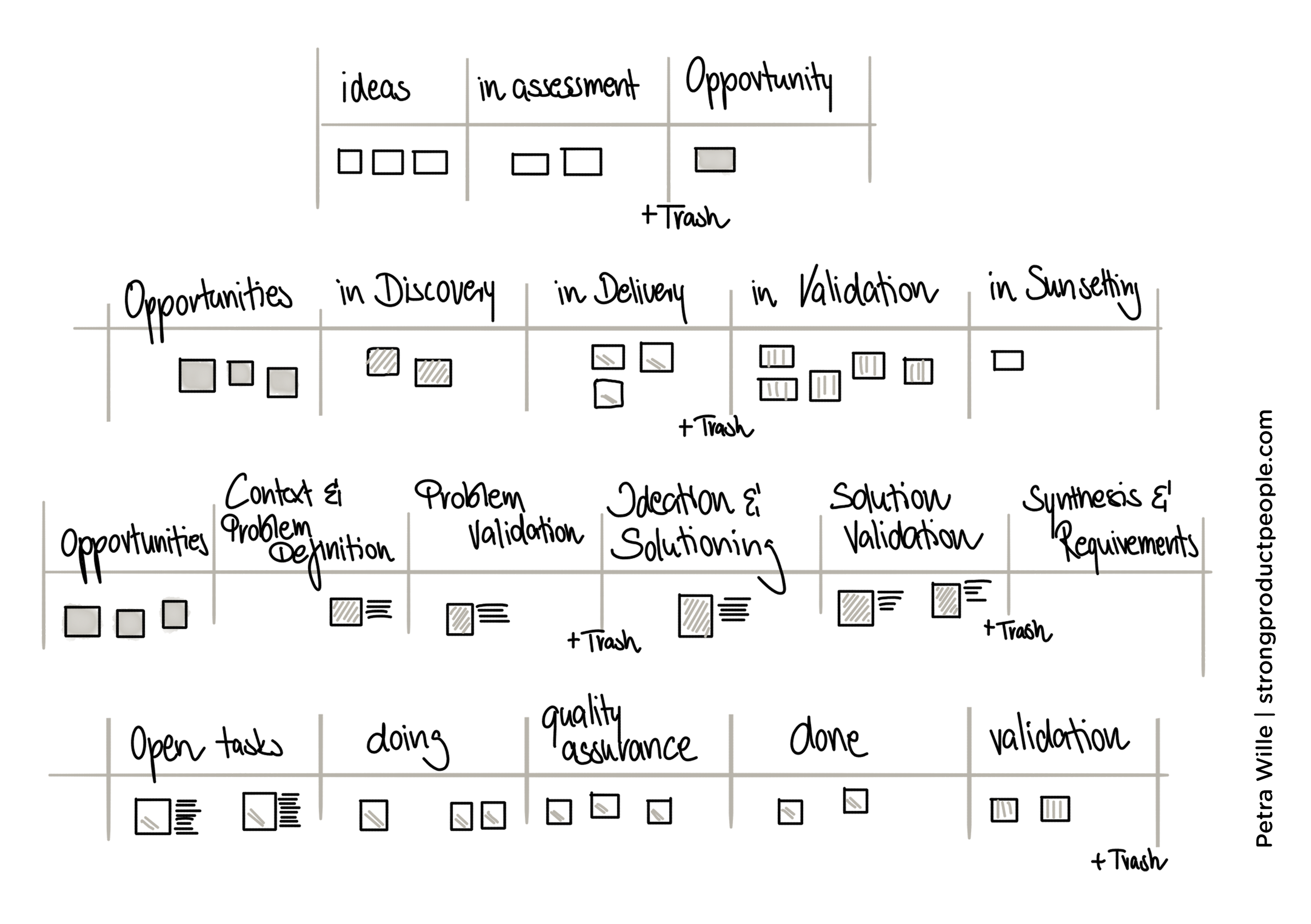 Depending on the size of the organization, it’s useful to create task boards with different levels of detail and focus. These range from a high-level idea board, to an overall product board, down to a product discovery board, to a development team board. You can see an example of what this looks like below.