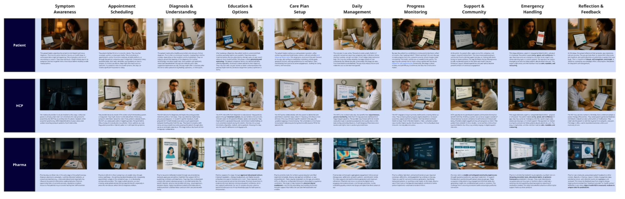 We didn’t stop there. We mapped the HCP side, too—what information they receive, how they make decisions, and what their interactions look like. Then we layered in pharma: what they’re doing at each stage, how they support the process, and where they connect with both the patient and HCP journeys.
